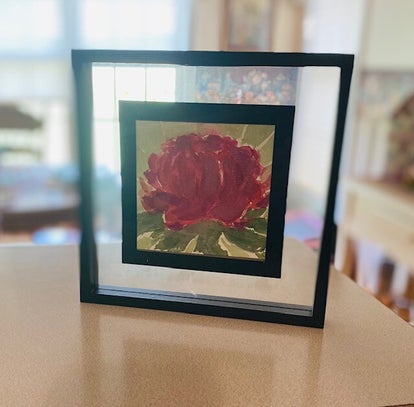 Any of our existing floral paintings can be painted in 4x4 in. size and framed in a cute, wood, white frame with glass.