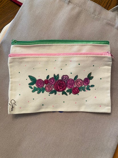 A canvas, zippered 5 x 8 in. bag that is hand-painted and great for holding all kinds of items...not just makeup.