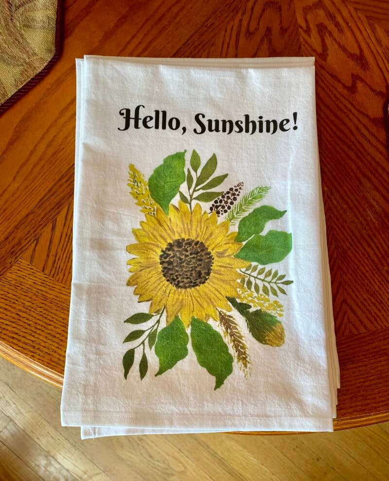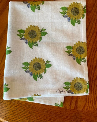 This kitchen tea towel, 15 x 20 in., with original watercolor art, shares your love of sunflowers and summertime. A bright and happy addition to your home decor. Quality fabric, machine washable, cold water, delicate; air dry. Iron from reverse side.