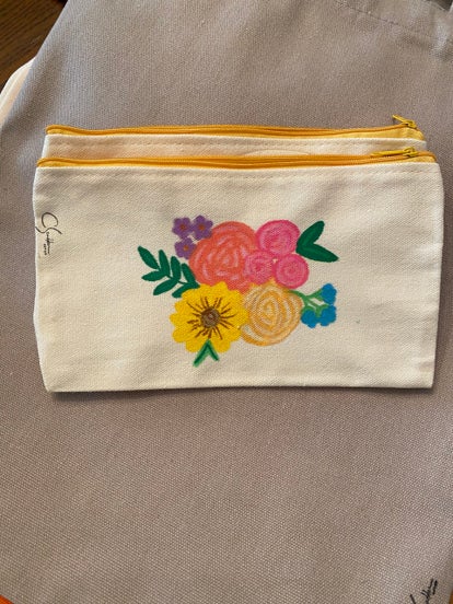 A 5 x 8 in. Zippered canvas cosmetics bag, hand-painted with a whimsical floral design.