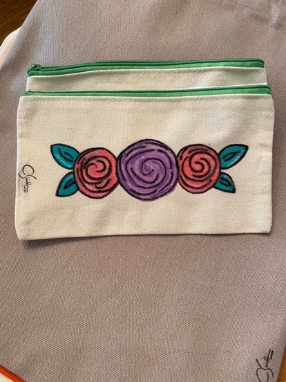 This 5 x 8 in. canvas zip cosmetics bag is hand-painted in bright colorful flowers. These canvas bags also work for pencil, pens, markers, jewelry, and other trinkets.