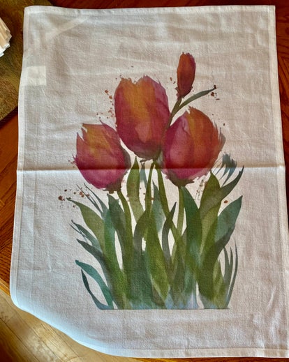 Bright and colorful kitchen tea towel, 15 x 20 in. with original watercolor art. These tulips will add flair to your kitchen decor! Quality fabric, machine washable, cold water, delicate; air dry. Iron from reverse side.