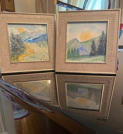 A simple mountain mini landscape can offer a bit of serenity on a busy day at the office. Add one of these framed watercolor paintings to your desk today. 4x4 inches