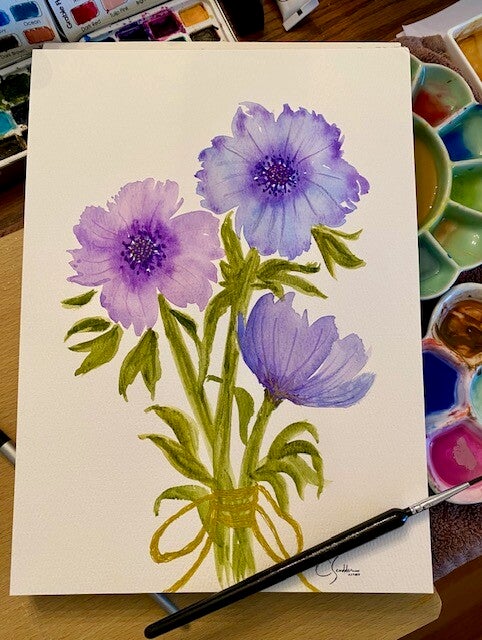 A hand-painted floral bouquet, 8x10 in., that can be matted to 11x14 in., if desired. A perfect addition to your home decor, this beautiful original artwork will brighten any room. This bouquet is painted in shades of lavender with hints of blue, but can be customized to colors of your choice.